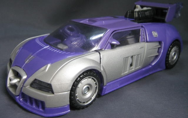 ビークルモードブガッティ ヴェイロンを意識した紫のスポーツカーに変形。ドリフトよりも先にとんでもない値段の高級車のブガッティが実写デビューです。こちらはあくまでもブガッティ風な上に他シリーズの玩具を流用したオリジナルキャラですが。