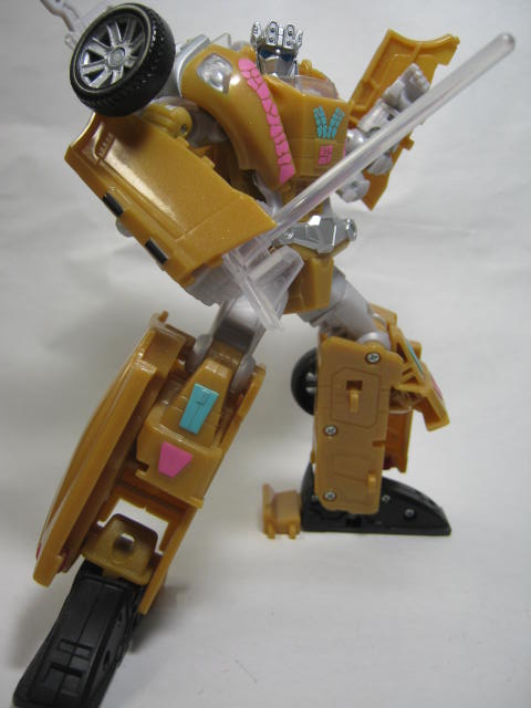 トランスフォーム!結構面白い変形をしており、フロント~側面が脚になり後部は腕に。ボンネットはアームでそのまま背中まで移動します。運転席部分がスライドして縮むのがお気に入り。しかし、その面白い変形ギミックでありながらエフェクトロに使われている金色のプラスチック(通称金プラ)は経年劣化が激しく、非常に脆くなりやすい素材でして、うっかりすると砕けてしまいます。なので弄る際はヒヤヒヤしながら遊ぶハメに。オマケにプレート状のパーツも多く、かなり気を使います。