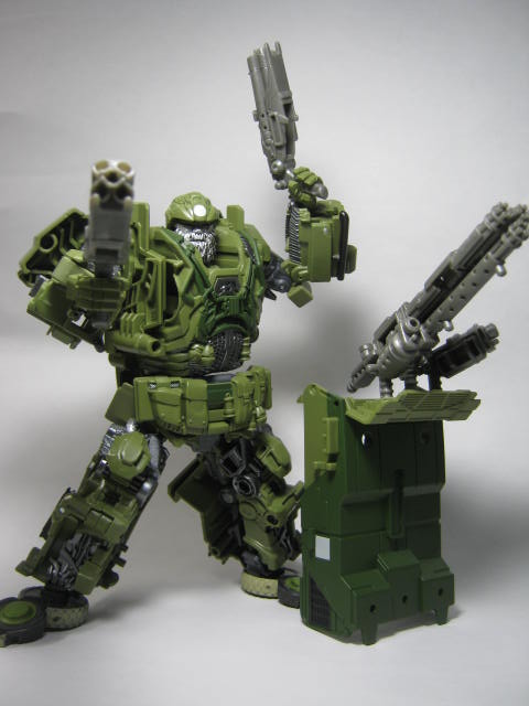 ハウンドも購入。予約してから随分経っていた為、正直な所興味を失っていたのですが、届いたので触ってみたら買って良かったと思えました。初期の宣材画像よりも緑が濃くなり、塗装も一部変更。ロストエイジ版の武器に変更された上にそれらを収納可能な荷台が追加されました。最後の騎士王版では劇中と違い荷台が無かった上に武器も違っていたのでそこを補完した仕様というのは嬉しい。最初はデカデカと残り変形パーツにならない荷台パーツが好きになれなかったのですが、武器を付けてみたらセントリーガンみたいで気に入りました。