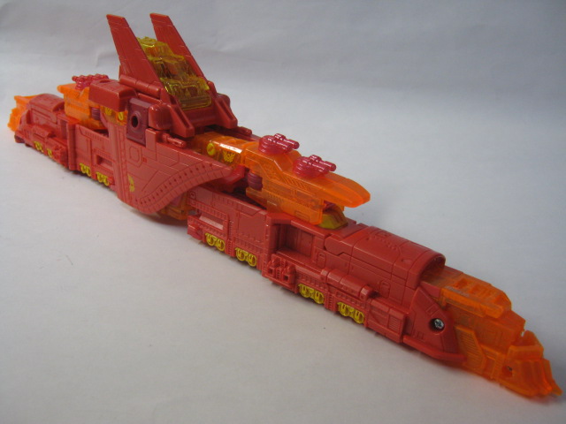 トリプルチェンジャーなので二種類のビークルモードに変形。宇宙船と装甲列車に変形します。クリアイエローのコックピットにインフィニタスを収納可能。