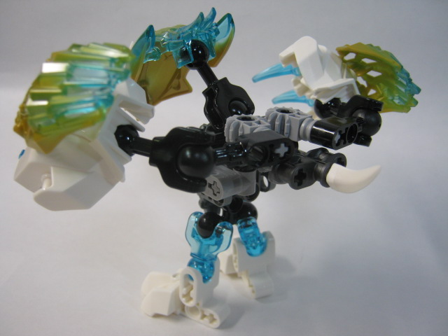 余談ですが以前バイオニクルのジャンクを譲ってくれた友人に新バイオニクルの事を伝えたらパッケージがプラスチックのボトルでは無くなってしまった事を残念がっていました。コストの関係だとは思いますが決してパーツとして使う訳で無くても「バイオニクルといえばボトルパッケージ」って印象が強かったので寂しい気持ちもありますね。逆に2012年のヒーローファクトリーでボトルパッケージを廃止した事によって、キャラクターによってサイズを統一する必要が無くなったメリットもありますかね。今回の様に、変則的な販売パターンのおかげで1セットでウリの合体ギミックが楽しめたりしますし。