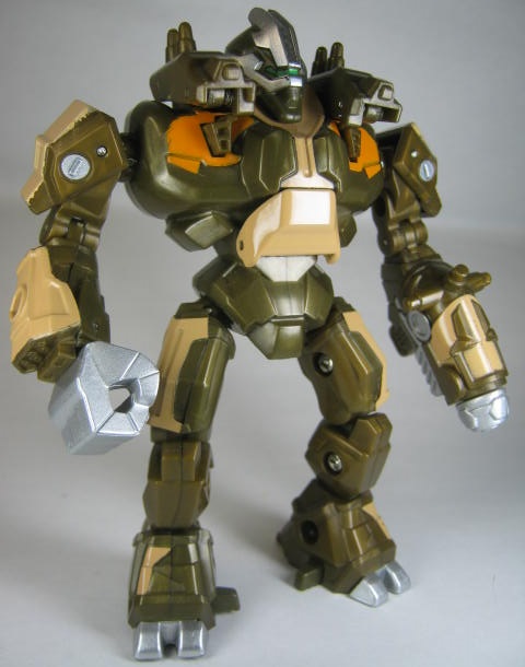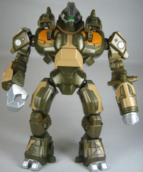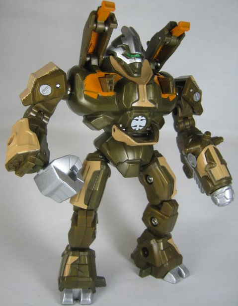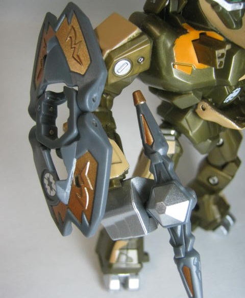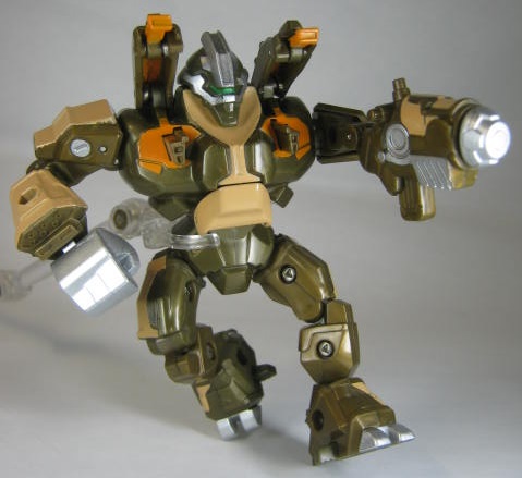 発動後の姿。胴体アーマーが開いてキャノンに変形。さらにその下にあったパーツも伸びます。他にも手動で手首を内側に曲げるとミサイルポッドの様なモノが出てきたり、腹のパネルを倒すことで属性マークが出現。火力アップ的な感じですかね。