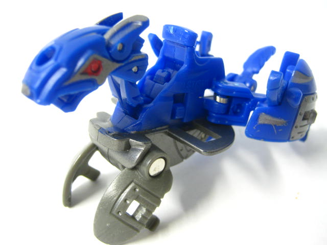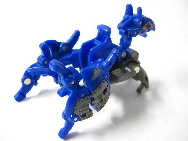 ゲートカードに乗せれば前足で跳びながら変形。犬の様な姿に変形。手動変形箇所は非常に多く、10か所にも及びます。ちなみにコイツ、変形後は脚が邪魔をしてマグネット部分が下に付かずカードとも接触しない為、スタンド成功失敗以前に