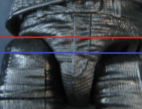 そして一番の衝撃が股関節。引き出し式になっています。赤が引き出す前の股関節、青が引き出した後。他の6インチ系列がそうなのかは知りませんが、マーベルレジェンズには無い構造ですね。