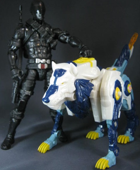 ティンバーという狼のパートナーがいます。元ネタになった3.75インチのバージョン2でも付属していたのですが、今回の6インチ版付属しないのでテキトーにTFのファングウルフで誤魔化す。デカいしメカメカしているじゃないか・・・。
