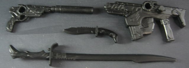 ・ピストル・サブマシンガン・ナイフ・刀が付属。ピストルとサブマシンガンにはジョイントが開いており、バックパックなどにも使われていることから、6インチG.I.JOEにおける共通ジョイントとして互換性がある模様。