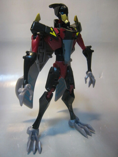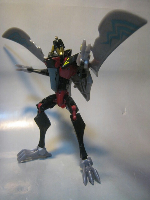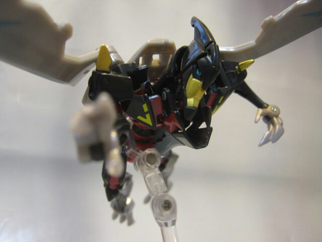 腕を羽から外して手足を調節、腰を回転、胸を開いて頭を出す位の変形なので結構簡単。