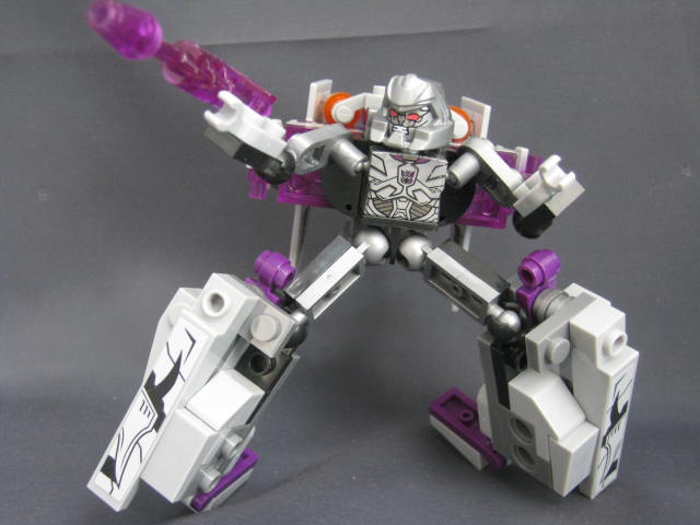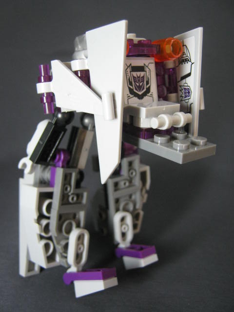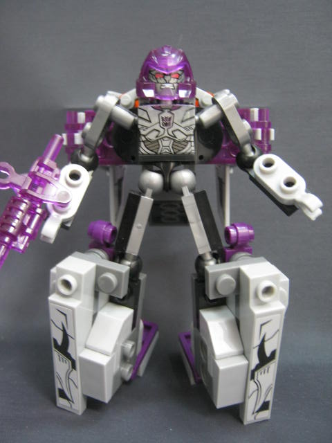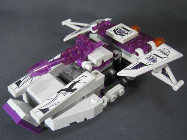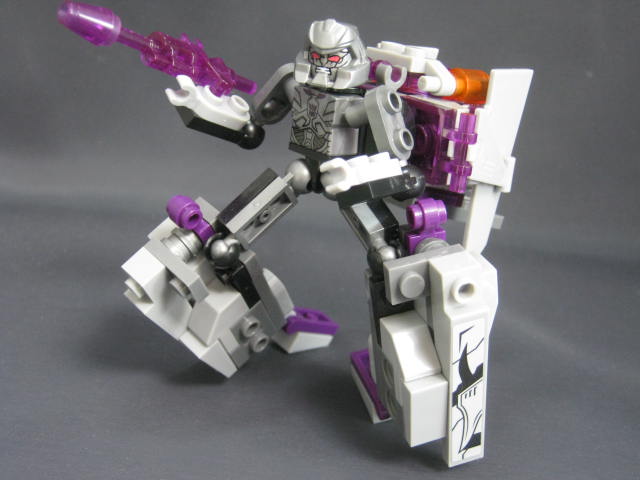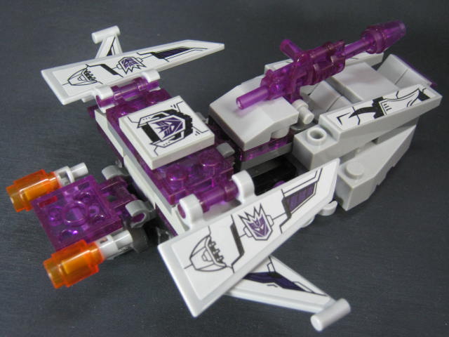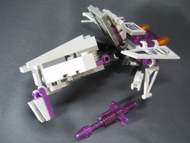 ロボットモード羽などが畳まれた事で特にこれといった特徴も無く、地味な見た目。ボリュームが背中と脚に集中し過ぎで、腕に何も装飾パーツが無いため、アンバランスではあります。パーツも大半が脚と背中に割かれてしまい、コスト的に腕に回すモノが無くなってしまった、という印象。そこはブロックなので手持ちパーツで補って行くのも1つの手でしょうか。
