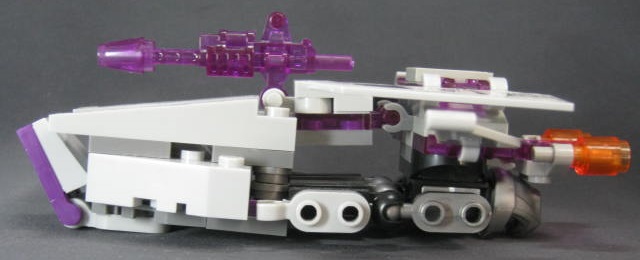 ビークルモードエイリアンシップ(サイバートロンビークル)に変形。エイリアンシップに変形するメガトロンは実写、プライム等がありますが、特定の作品のデザインを意識した訳では無さそうです。各部のクリアパープルが綺麗。模様はシールで再現。各ロックがカッチリしていて好印象。エイリアンビークルという関係上、良く解らない見た目になってしまいますが、しっかりとロックされる分、好感触。