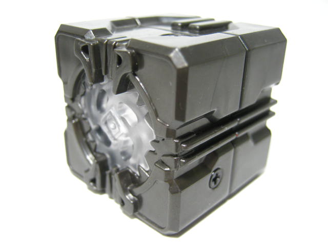 まずは付属のオールスパークキューブ。本シリーズの核となるアイテムで、全対応商品のサウンドがこの中に全て収められています。1作目に登場したキーアイテム、オールスパークが5作目の玩具オリジナルラインでまた出てくるとは思いませんでした。デザインはだいぶ異なってはいますが。内部にバッテリー内蔵。表面にはライトとスピーカー、裏面が充電端子と認識端子が配置されています。このままだと特に何も遊ぶ事は出来ません。認識は特撮玩具等によくある押されるピンの数による方法等と違っている様で、指等で押して誤魔化して遊ぶ、なんて事は難しそうです。全サウンドが聞きたかったら大人しく全部買った方が良さそう・・・。