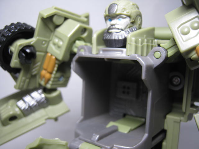 ロボットモード太った軍人の様な姿に変形。ボディが手榴弾の様なデザインになっています。劇中に近いのかはよく解りませんが、他の玩具とは違った独自の解釈で面白い。後ろからみると手足のパネルのおかげでがっしりした体系に見えますが、実際にモールドされている手足は意外と細めです。頭部と足首はオプティマス同様に柔軟素材を使用。