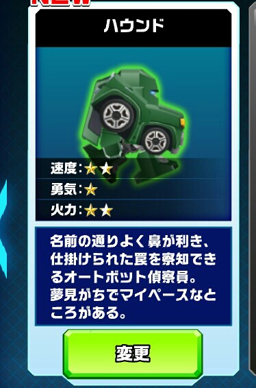 アニメでは各話のゲストとしての出番はありませんでしたが、最終回の全員集合シーンにしれっと登場。台詞等はありませんでした。ゲームアプリの設定によると、オートボットの偵察員でマイペースでどこか夢見がちな性格との事。