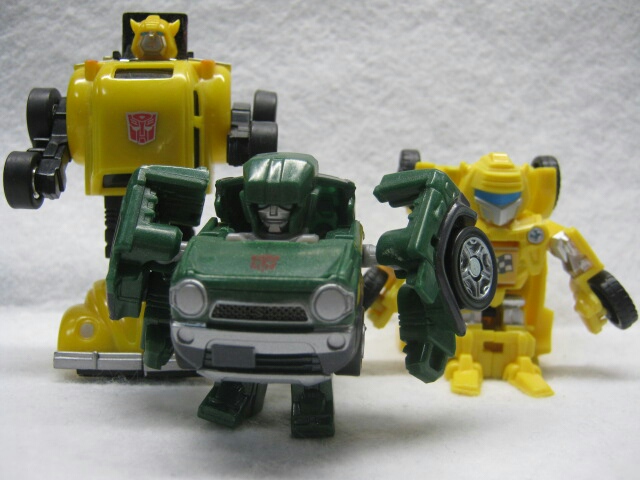 G1バンブルとビークールのバンブルビーと。ニューミクロマンのチョロQ(やはりゼンマイ未搭載)から変形するコンセプトだったミクロロボットCARの流用であるG1バンブルと、共通の変形パターン、デフォルメスタイル等の共通点が見られるビークールのバンブルビー。ある意味、QTFはミクロボットカーやビークールのコンセプトを引き継いだシリーズとも言えるかも知れませんね。