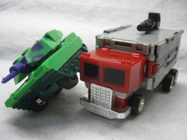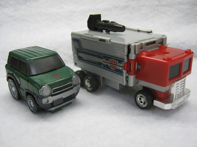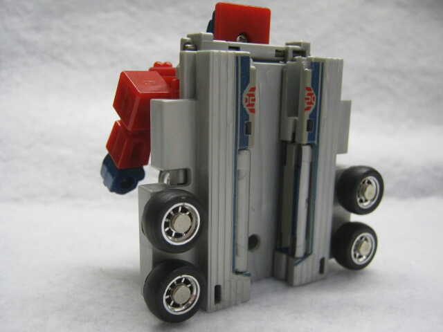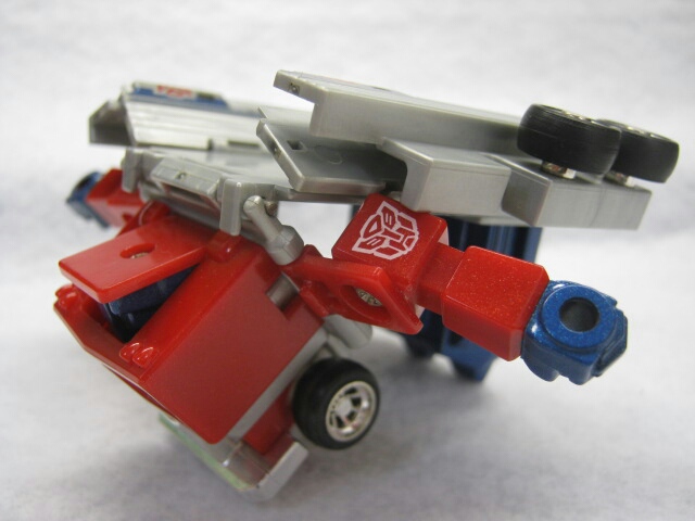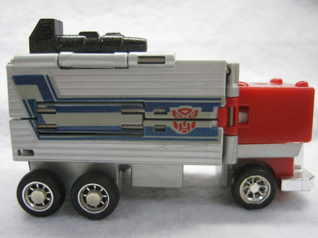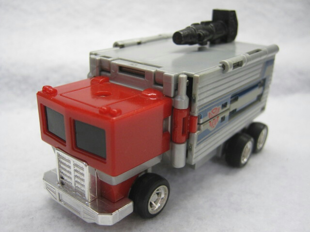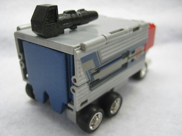 ビークルモードはG1風のコンテナ付きのトレーラートラック。ただし、キャブとコンテナが一体化したモノにアレンジされています。日本で見掛けるトラックとかはコッチのタイプの方が多いかもしれませんね。キャブの横がロボットモード優先で窪んだままなのでちょっと見映えは悪いかも。グリルとバンパーがメッキ仕様なのはいい感じです。