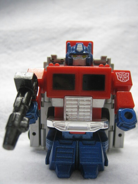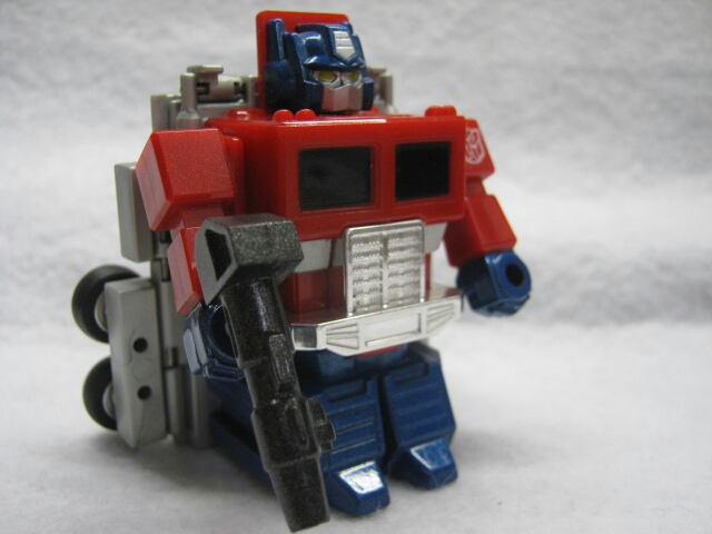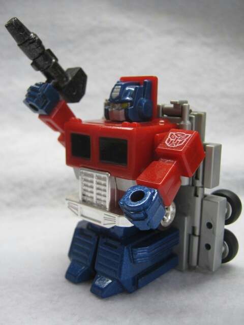 ロボットモードG1コンボイらしさがしっかりと出たロボットモード。背中には畳んだコンテナを背負っています。デフォルメされた見た目ですが、5頭身位はありそうです。左肩にちゃんとサイバトロンエンブレムがあるのがポイント。