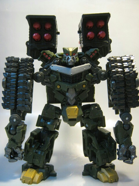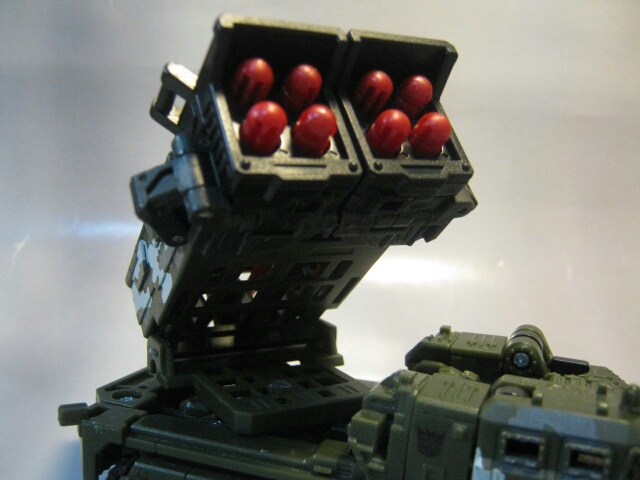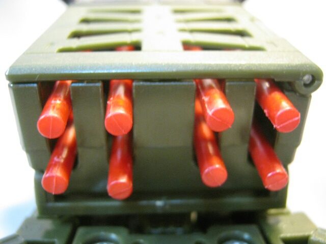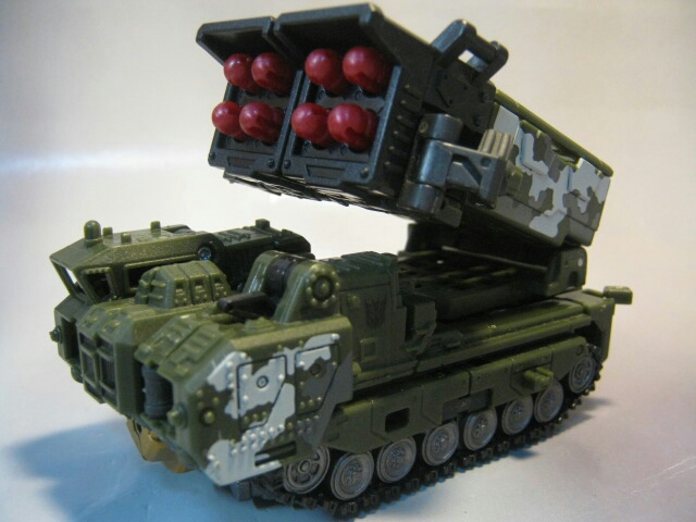ダークグリーンのボディに黒のキャタピラ、赤いミサイルが素敵です。サイズはデラックスクラスですが、コックピットのサイズ等から考えるにかなり大きいビークルと考えられます。