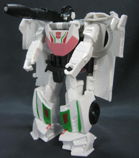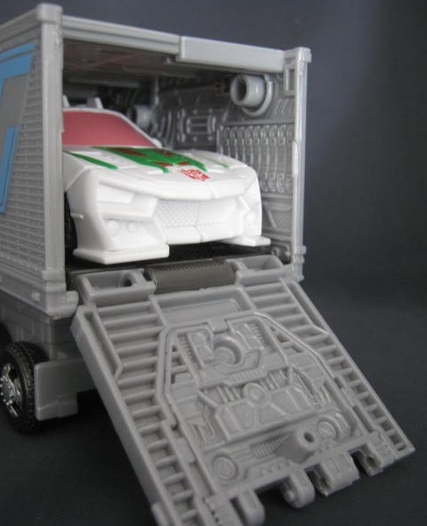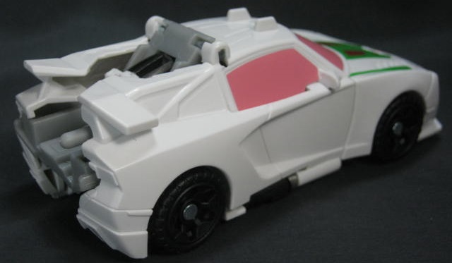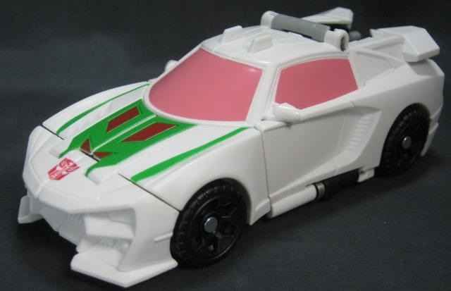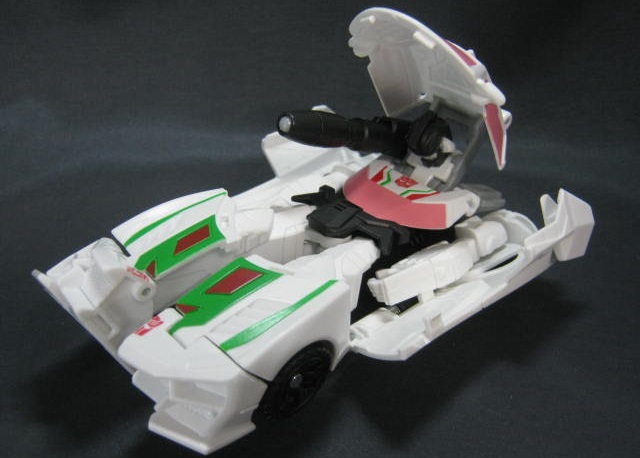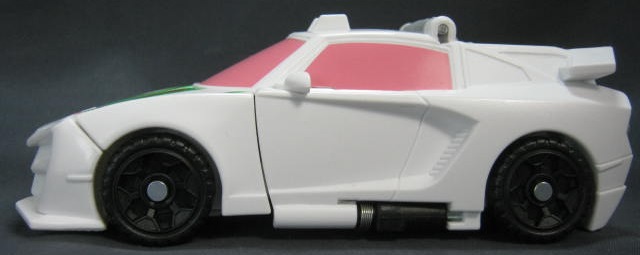 ビークルモード緑のストライプが特徴の白いスポーツカーに変形。G1を意識した外見ではありますが、アレンジは強め。