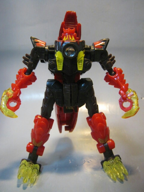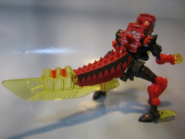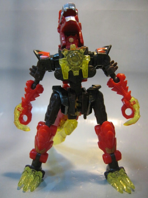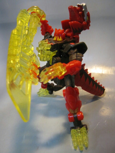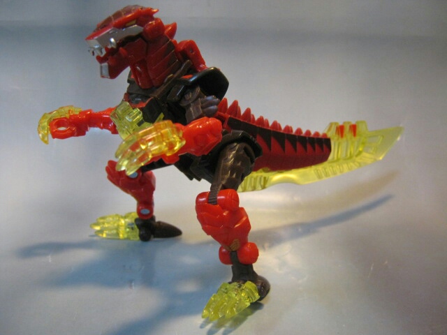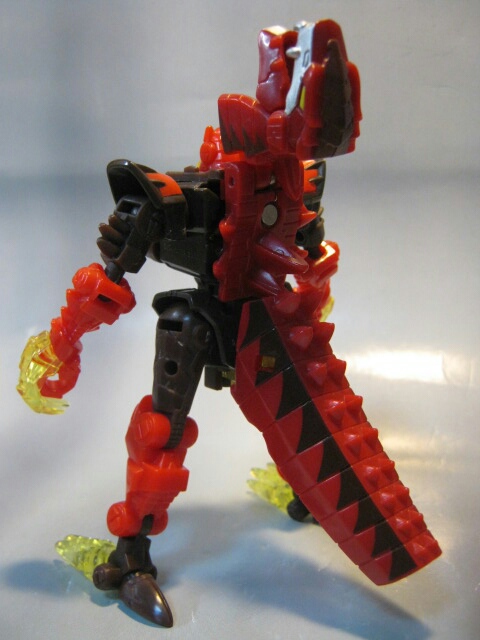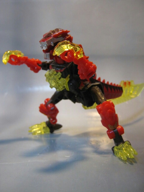 ラプターっぽい恐竜に変形。マグマタイプなだけあって赤と焦げ茶のカラー。クリアカラーの尾と爪が綺麗です。通常カラー版では無くマグマタイプを選んだのは勿論このカラーが好きだったから。変形ギミックの都合上、仕方が無いのですが腰がちょっとフラフラしているのが残念。見た目もちょっと変です。