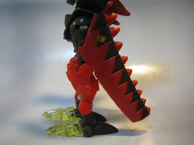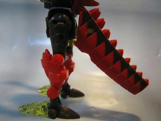 ちなみに説明書では触れられていませんがロボットモードで尾を開いた後、腿に接続する事が出来ます。ちゃんと専用のジョイントもあり見た目も少し変わるので結構好きだったり。その代わり、脚の可動が死んでしまうので説明書には載せなかったのかも知れませんね。