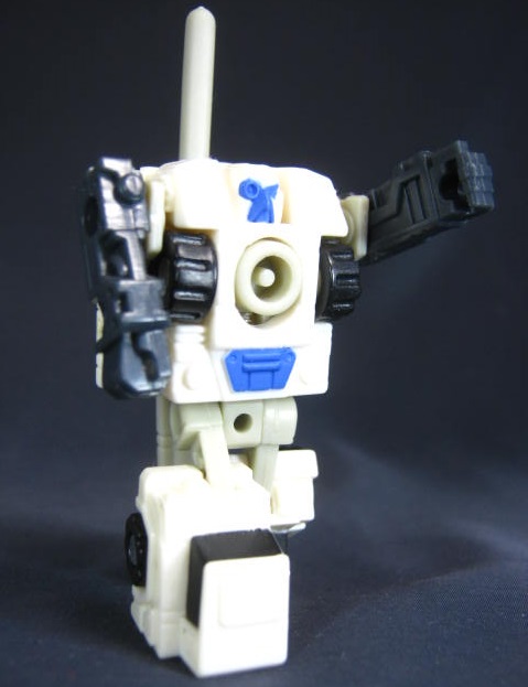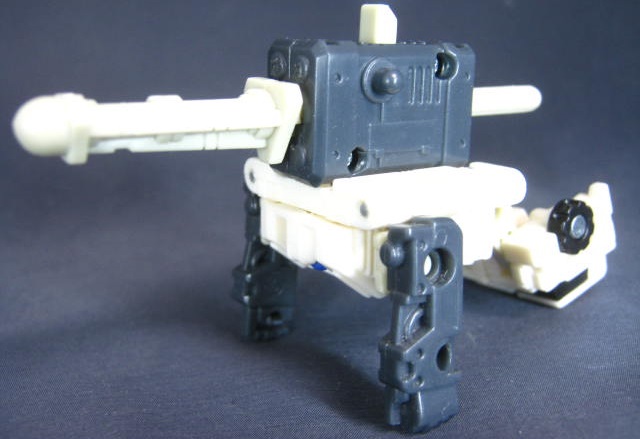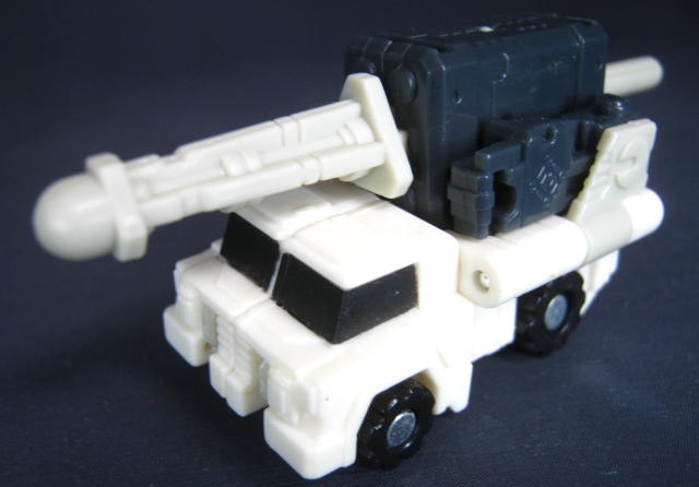 ロボットモードスコープを付けたような右目、箱型な体型とそのまま背負ったミサイルが目立つ姿。手足を展開するだけの、ミニコンにありがちな変形で特にこれといった面白みはありませんね。ミニコン全般に言える事ではありますが、顔つきがそこまでヒロイックで無かったり、通常のTFではあまり見ないようなユニークな顔が多いのが地味に好き。小さいので細かい造形が出来ないというのがあるかもしれませんが、通常TFとは違う種族らしい要素ともとらえられるので好き。