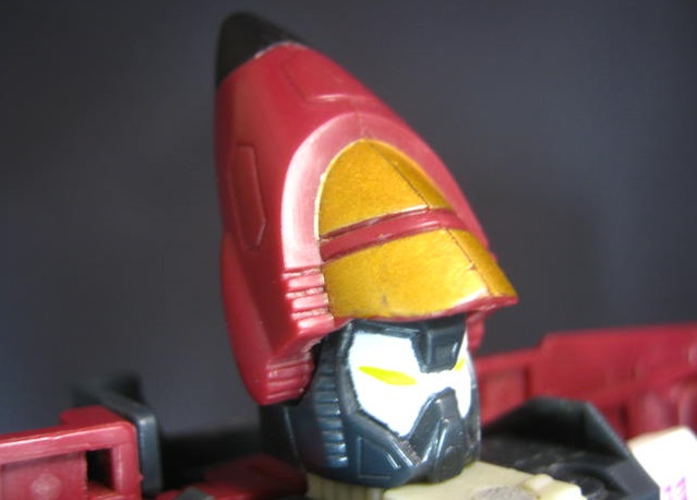 フェイスアップG1ライクなトンガリ頭だけで無く、パイロットのマスクの様な口も特徴的。G1版と違ってキャノピーの一部まで頭部に来ているのがユニーク。頭部に来ているのはダミーですけども。顔が白いのもG1アニメ由来かな?