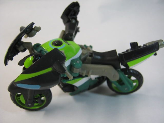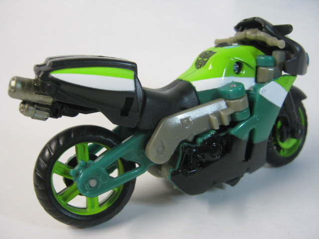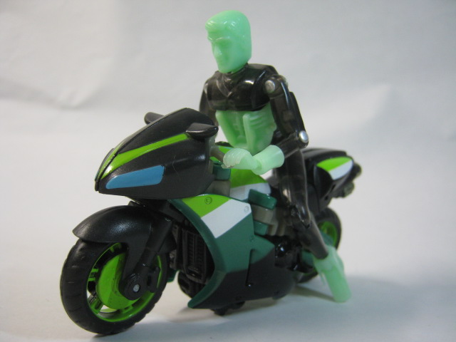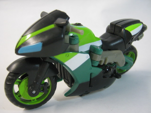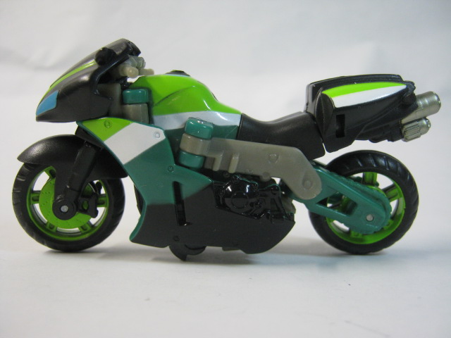 ビークルモードフルカウルのオートバイに変形。黒いボディに緑の外装やラインがカッコいい!