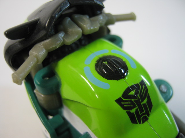 ハンドルも細かく造形されていますがしっかり閉じないのが残念。変形にも使うので油断しているとすぐ開いてしまったり。タンク部分にはオートボットのエンブレムがプリントされています。