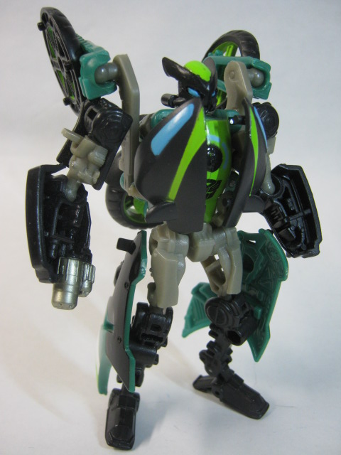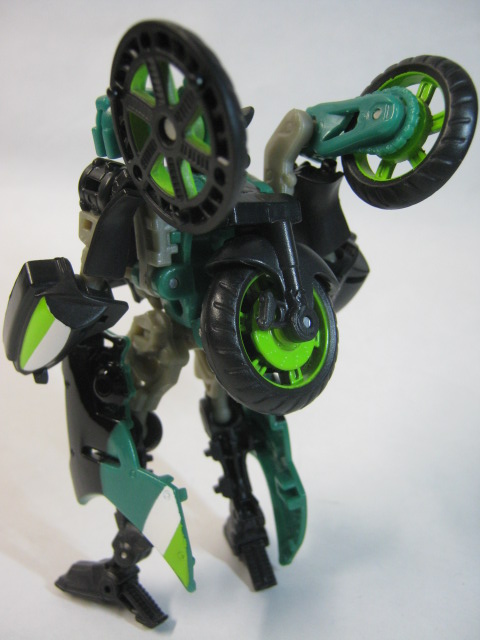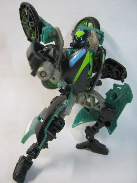ロボットモードビークル時のスラリとしたバイクのイメージを損なわ無いスタイル。右腕はバイクのエグゾーストパイプがそのまま武器になっています。実写TFは腕がそのまま武器に変形する事が多かったのでいい感じ。