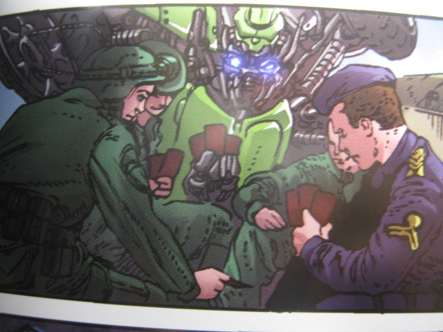 玩具とはデザインが少し変わっていますがNESTの兵士と一緒にトランプをしている姿を確認出来ます。一度のみならず二回もその姿が描写されており、かなりのトランプ好きの模様。「ロボヴィジョン」なる機能を使って勝ちまくっている模様。