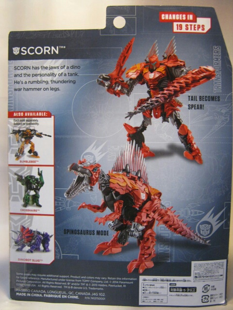 ちょっとメカニカルなデザインのスピノサウルスに変形。国内版であるコチラは赤い部分はほとんどが赤の形成色の上からさらに赤で塗装され、高級感があります。劇中ではダイノボットは皆、銀一色の様ですが、玩具では各ダイノボットの差別化や地味っぽさを防ぐ為か、真っ赤なオリジナルカラーとなっています。尻尾と背鰭は柔軟樹脂製。ちょっとくさい。