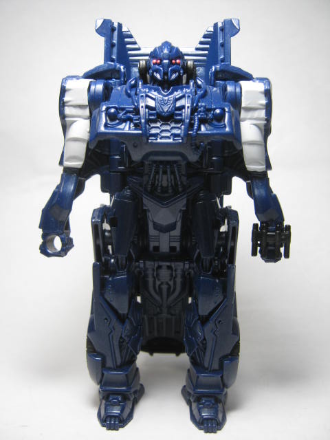 やや縦長気味なプロポーションのロボットモード。背中に結構な量のガワが行っています。胸のボンネットはダミーで、ビークルモードの後部を構成していました。黒っぽく、モールドも多いのですが、ロボットモードでも塗装が少ないのでごちゃごちゃしていてやや解り辛く、勿体ない。もう少しどうにか出来なかったのだろうか。腕に装備しているガトリングは回転可能で、右腕にはスタンガンのモールドがあったりと小さな拘りが感じられて良い。