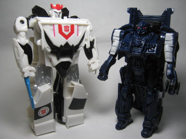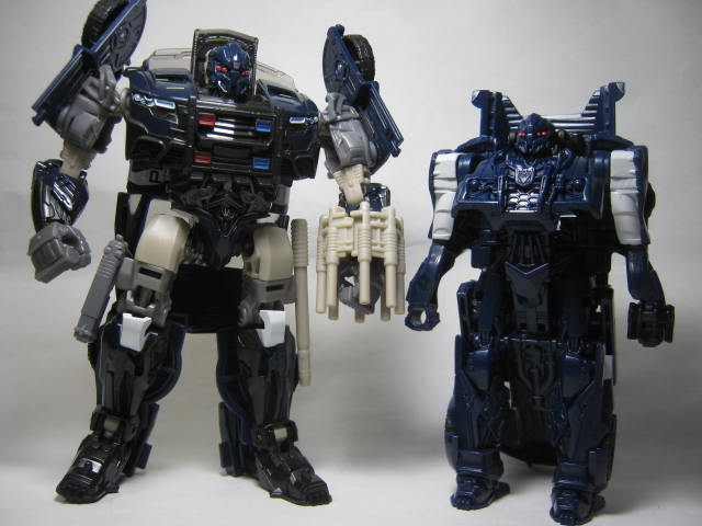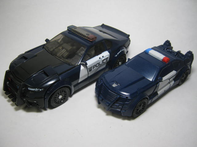 デラックスクラスのバリケードと。こうして比べてみるとやはり塗装の省略が目立つ。ロボットモードではマッチョな体系のデラックスクラスとホッソリしたスピードチェンジで対照的な体系。そして腕の白いペイントがデタラメである事も伝わってしまう。膝とかに塗って欲しかった。