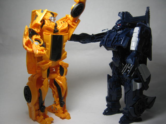1作目からなにかと対峙する事の多いバンブルビーと対決!お互い腕しか動きませんが、そこは想像力でカバーしよう!
