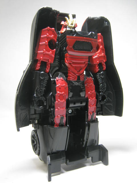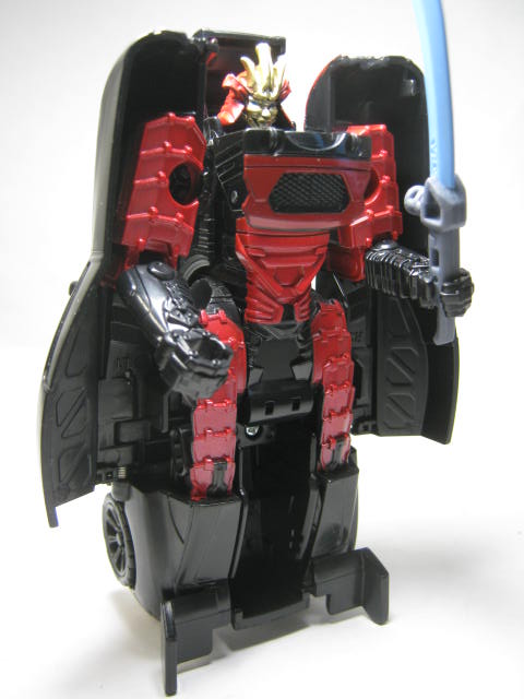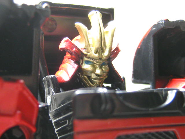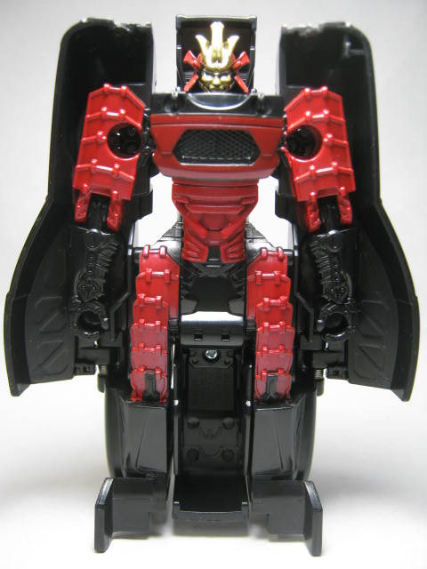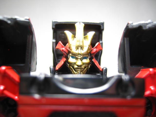 ロボットモードビークルを立て、左右が割れて真ん中が表裏入れ替わった変形。プロポーションは微妙ですが変形が面白いので個人的には気にならない。鎧の赤は塗装ですが、地味に面積が広くていい感じ。胸のフロント状のパーツはダミーでは無く、リアパーツが胸になっています。ビークルの正面を模したパーツが後部に付いていたと言うのが面白い。