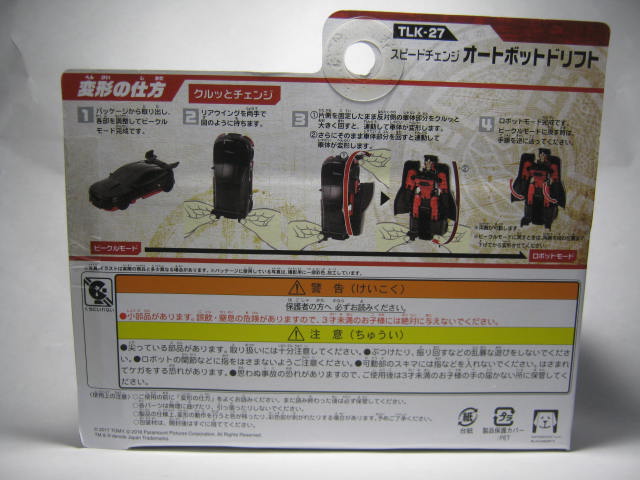 以上、スピードチェンジ版ドリフトでした。シンプルで捻るだけという動作ですが、変形玩具にはあまり無かったり、このサイズで楽しめると言うのが素晴らしい。ちゃんと各部が連動してへんけいする他、左右で順番も決まっている。この変形の面白さはバリケード以上に面白く、スピードチェンジシリーズの中でも一番の傑作だと思います。