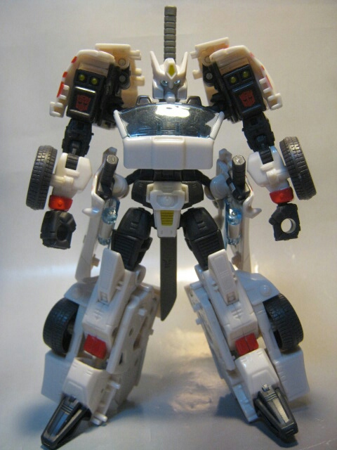 どっしりとした脚、腰に付けられたドア、後へ大きく延びる肩等、どことなく暴走族チックなデザインのロボットモード。背中には大刀、腰のドアには小刀を収納しています。肩のデザインが好きです。