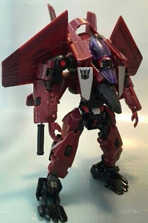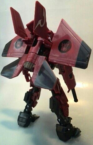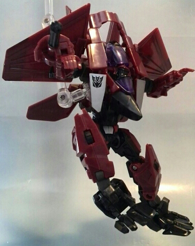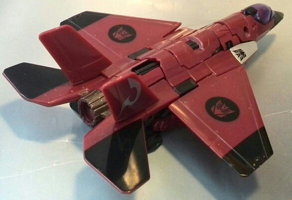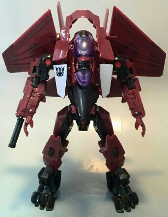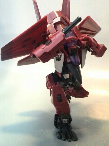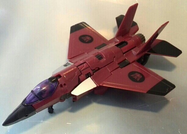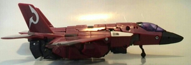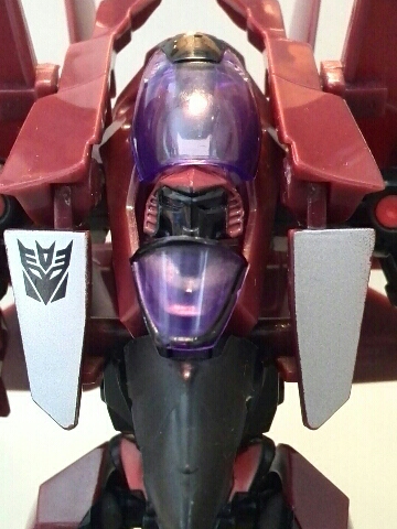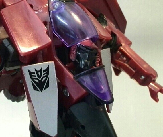 小豆色の機体がスラストらしさを出しています。さらに、主翼の円に囲まれたディセプティコンエンブレムがG1スラストの特徴である垂直離着陸用ファンを連想させます。形状を変えずに塗装だけでそれっぽさを出す工夫がナイス!クリアパープルのキャノピーがいかにもディセプティコンって感じです。