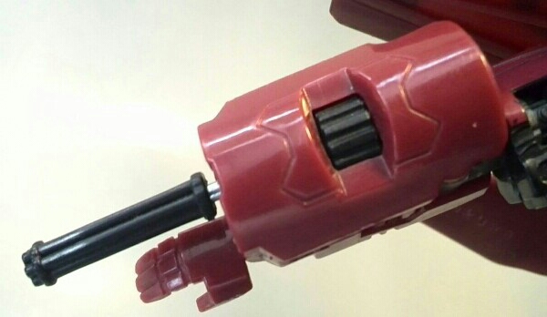 右腕に小型のガトリング状の武器を装備。取り外す事は出来ません。ガトリングの先端を回すと腕の黒パーツも一緒に回るリベンジシリーズ共通ギミックであるメックアライブを搭載。スラストのは簡素で地味なモノではありますが、簡易ラチェット機構でカリカリと回す事が出来ます。