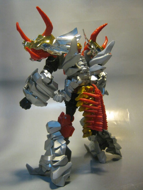 後ろ足を伸ばして脚にし、胴体を腕に。頭部はバックリ左右に開いて肩にします。武器を胴体に刺したままの変形が可能です。