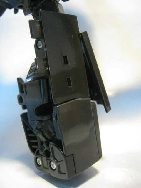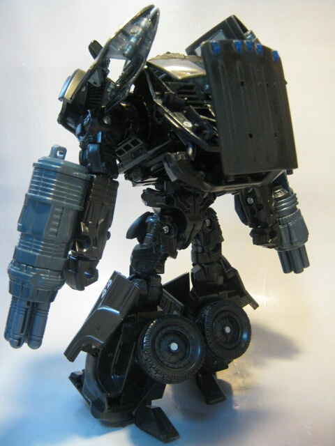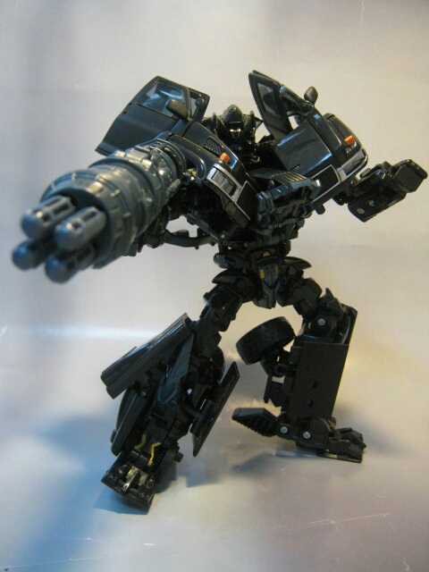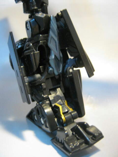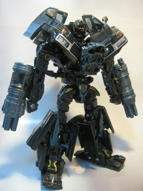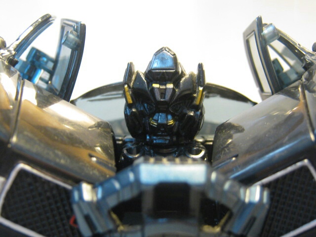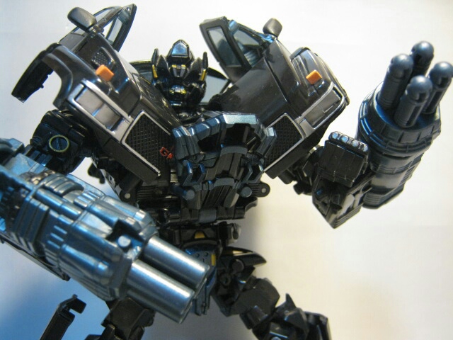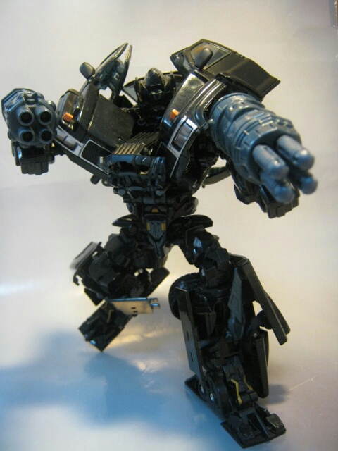 斜めに生えたらボンネットと腕のキャノンが特徴的なロボットモード。まっ黒なボディと各部の金とスチールブルーの塗装やパーツが良い感じです。背中のガワも折り畳まれてコンパクト。劇中と比べてスラリとしてますが、コチラの方が私は好みだったりします。