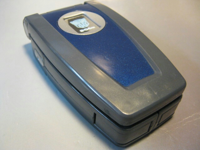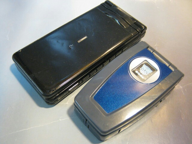 グレーのガラパゴスケータイ、いわゆるガラゲーである折り畳み式携帯に変形。