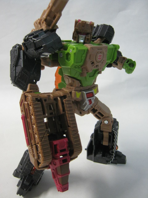 フライホイールがモチーフ。といってもそれは後述の頭部モードとミニビークルが関係しているのでロボットモードでは特にそれらしい要素は無し。商標登録の都合か、名称が変更されています。元々ヘッドマスターで無い彼が何故、タイタンマスターになったのか、今回はどんな性格なのかはパッケージに記載が無いので不明。残念。