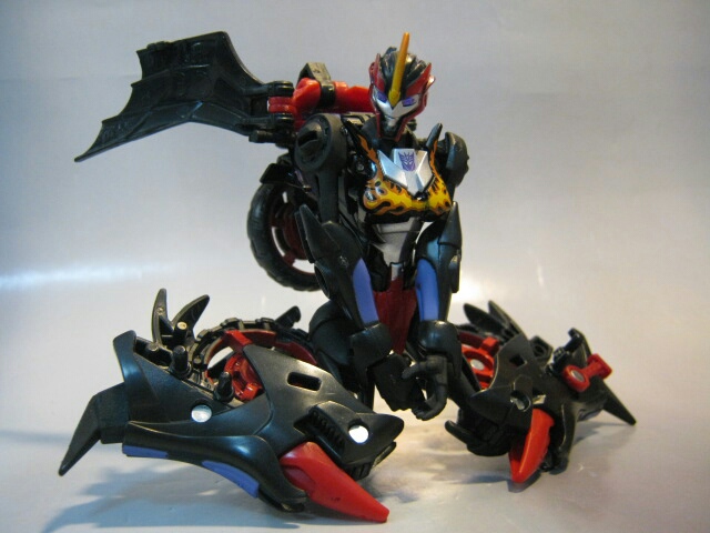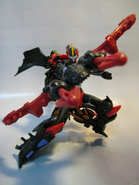 黒と赤のボディにファイヤーパターンが目を引くロボットモード。胸にはディセプティコンのエンブレムがプリントされています。傭兵だからか、スターシーカー専用のエンブレムでない辺り細かいですね。背中の羽が小悪魔チック。