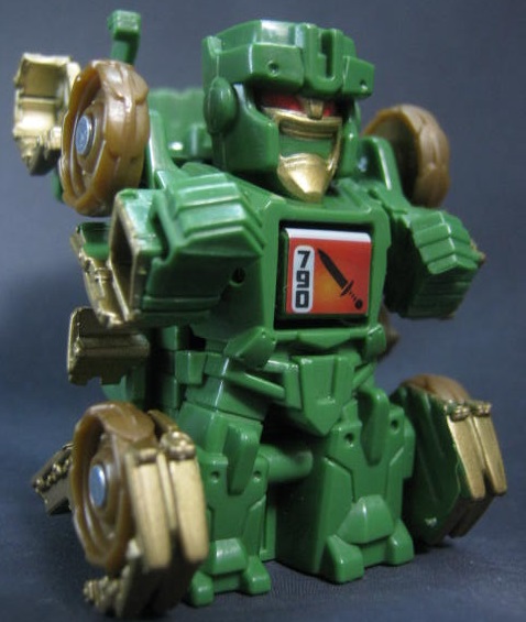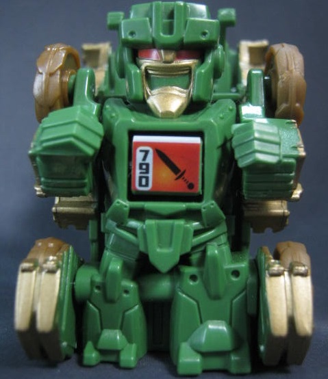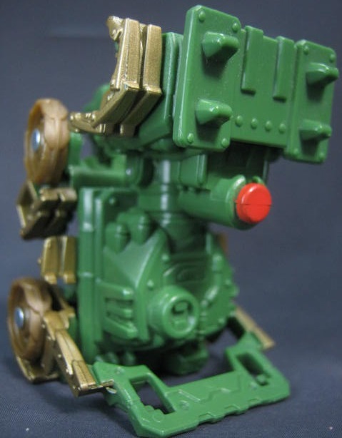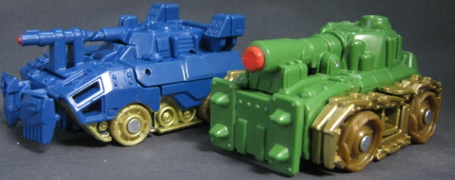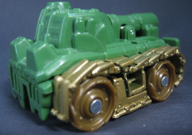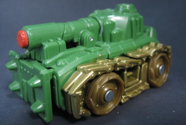 ビークルモードシリーズ1で3色も出ていたブロウルが、シリーズ2でも新規で登場。緑色の戦車に変形。バク転するフリップショット型です。単品販売もされていましたが、そちらと比べて成型色が濃く、塗装もガンメタルからブロンズに変わっています。