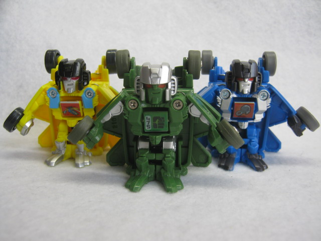 元々、初代スカイクエイクはヨーロッパで展開したシリーズのキャラクターですが、恐らく時期的にプライムで登場した方を意識したものだと思いますが、とちらにせよ、あんまり似てないのでなんとも言えない所。緑のディセプティコンの戦闘機って位しか共通点が無かったり。ちなみに、何故か後から発売した別の3パック版にもスカイクエイクがラインナップされており、そちらはクリア版。ボットショッツ謎のスカイクエイク推しである。