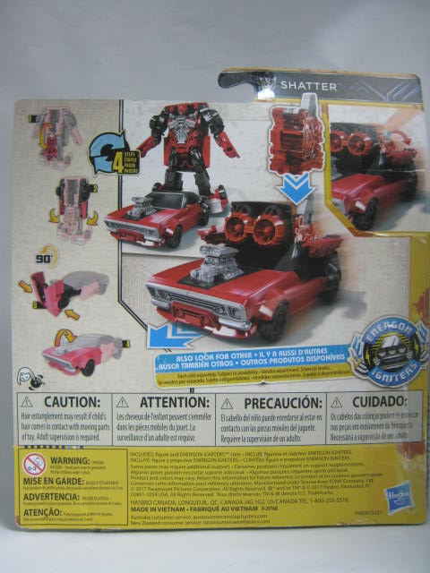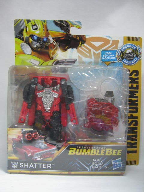 パッケージバンブルビーをイメージした黄色の台紙のブリスターパッケージ。左上のバンブルビーは全キャラ共通。いわゆる「TRY ME」仕様でエネルゴンイグナイターシリーズのウリである「リアクターコア」のトリガーを押せる様、ブリスターには穴が開いています。説明書も兼ねているようです。最近はこのパターン多くなりましたね。「エネルゴンイグナイター」はスピンオフバンブルビーに合わせて展開しているシリーズで、その名の通り、エネルゴンを意識したエンジン状のパーツ「コアリアクター」を軸にしており、大型の「ニトロ」、中型の「パワー」、小型の「スピード」(EZコレクション相当)の3サイズで展開しています。今回紹介するモノは「パワー」に「コアリアクター」が同梱された「パワープラス」というクラスになります。