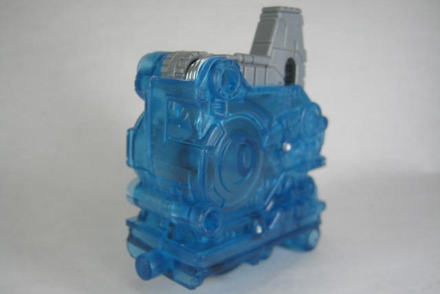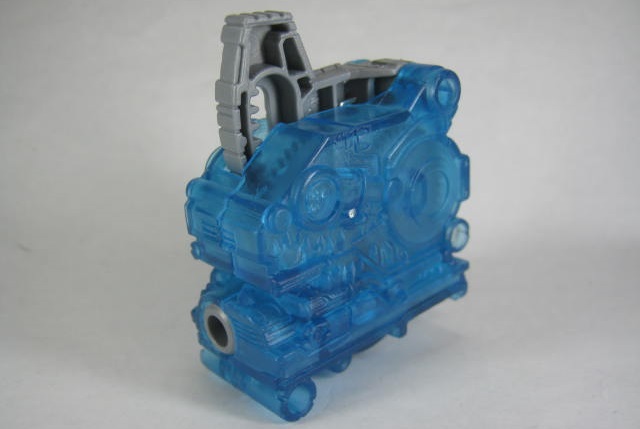 ギミックの中心である「コアリアクター」。基本的な仕様は以前紹介したビーのモノと同じなのでそちらを参照して下さい。「ニトロ」版バリケード、パワープラス版シャッターに付属のモノと同じ型のモノのようです。ディセプティコンに合わせてクリアレッドだった前者2種と違い、こちらはオートボット仕様ということでクリアブルーになっています。