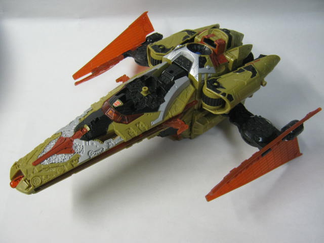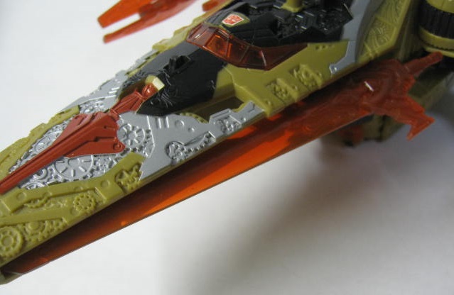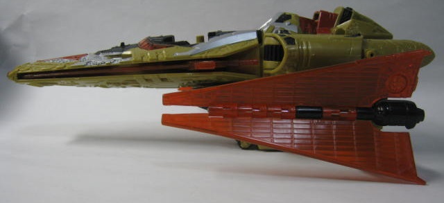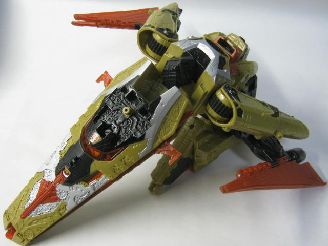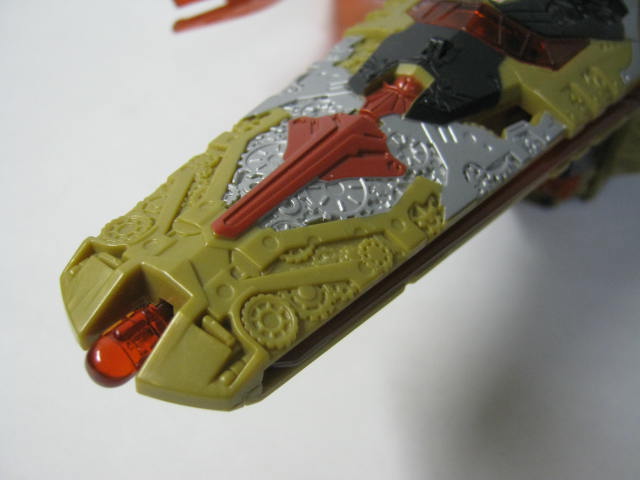 ビークルモードSFビークルに変形。ベクタープライムがプライマスによって作られた最初の13人のTFという設定と時間を操れる能力からか、歯車が多かったり、従来のSFビークルに変形するTFとはまた違った雰囲気があります。リペイント元の通常カラーのベクタープライムは銀、水色(海外版は白)なのに対し、このバージョンは金、オレンジと対照的なカラーリングになっています。ちなみに