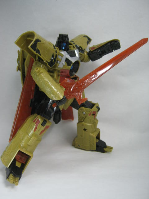 ロボットモードで剣とセーフガードを装備。ミニコンジョイントが両腕にあるのでルーツは左右どちらにでも付けられます。