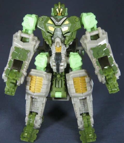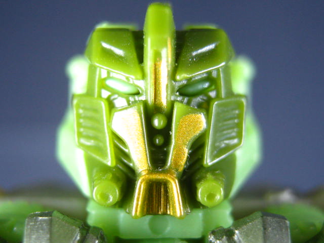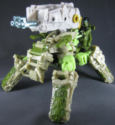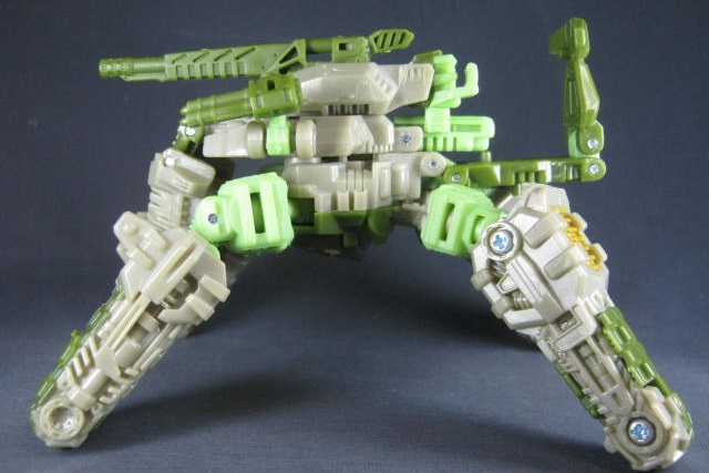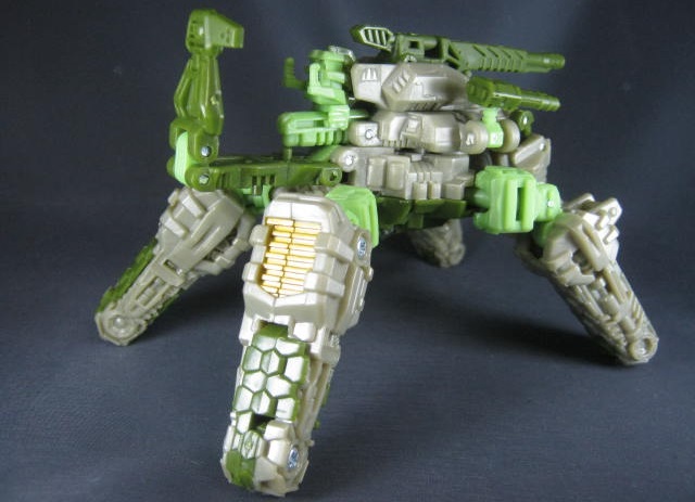 ビークルモード緑のスパイダータンクに変形。キャタピラの付いた脚が特徴。四本脚の角度が特に固定されないので微妙に決め辛いのが難点。説明書ではビークルモードでは無く、ウェポンモードに該当するモードらしいですが、ちょっと違和感があったので私はビークルモード扱いにしています。緑の戦車ということで個人的にはハードヘッドを彷彿とさせたり。同じヒューマンアライアンスベーシックの